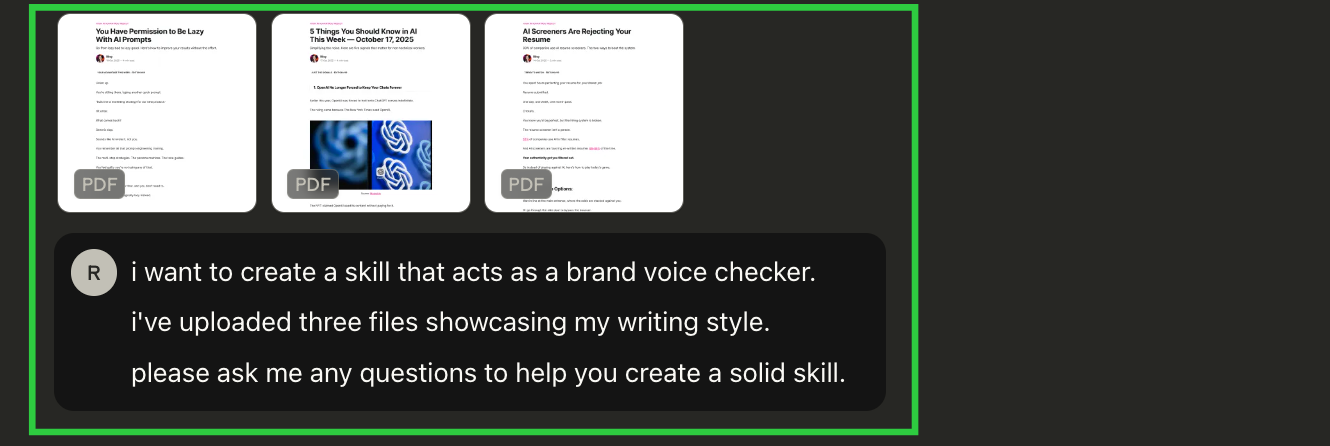 Pro Tip: If you have an existing project or prompt that already captures your process, ask Claude to create a skill that turns itself or a component of it into a Skill.